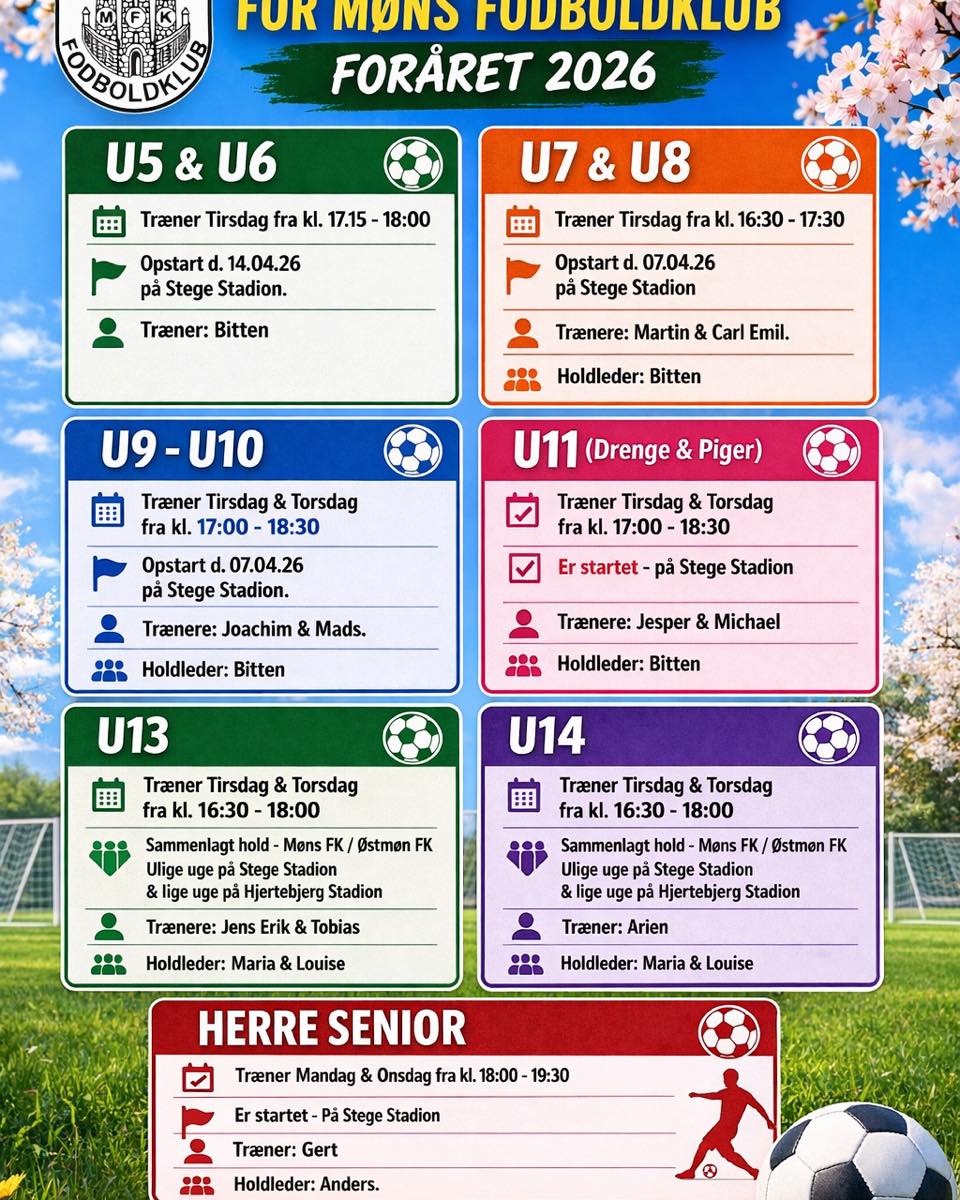 Går du rundt der ude og synes du har et par timer i overskud og gerne vil være en del af Møns fodboldklub, så søger vi træner til følgende hold: